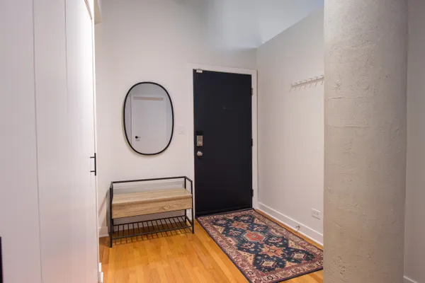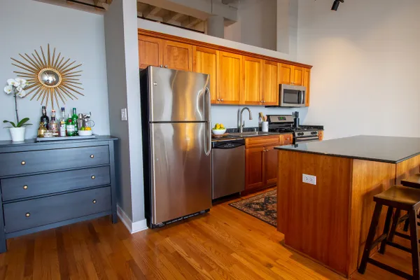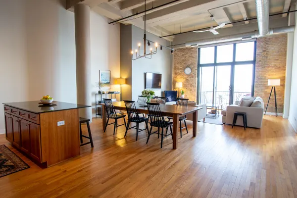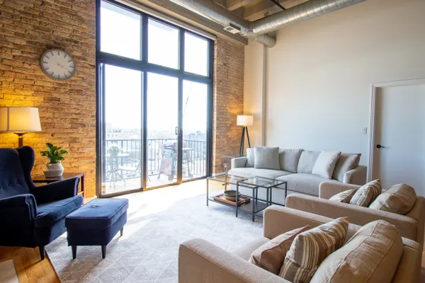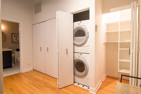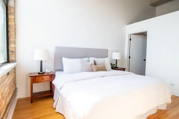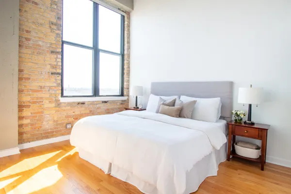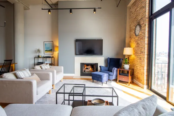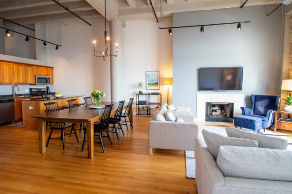Stunning 2 be/2 bath loft condo. Perfect for entertaining, open floor plan features dramatic 14-ft ceilings, spacious kitchen with an island, exposed brick and duct work, hardwood floors, gas fireplace & breathtaking skyline views. Eleven-foot windows in the living room, with southeast exposure, offer tons of natural light & open to a spacious balcony. Foyer features extra storage, washer/dryer & beautifully updated full bath. Spacious second bedroom with two generously sized closets. Smart thermostat allows smartphone controlled heat & AC. New water heater installed December 2018. Master bedroom with stunning view includes custom motorized blackout shade, huge walk-in closet (custom storage extending up 11-ft) & newly remodeled spa bath. Unit includes a storage locker & parking spot in attached heated garage. Steps from Target, Xsport Fitness in the same building, 1 block from Whole Foods, short walk to Southport Corridor & Roscoe Village, 2 blocks from Paulina Brown Line stop.